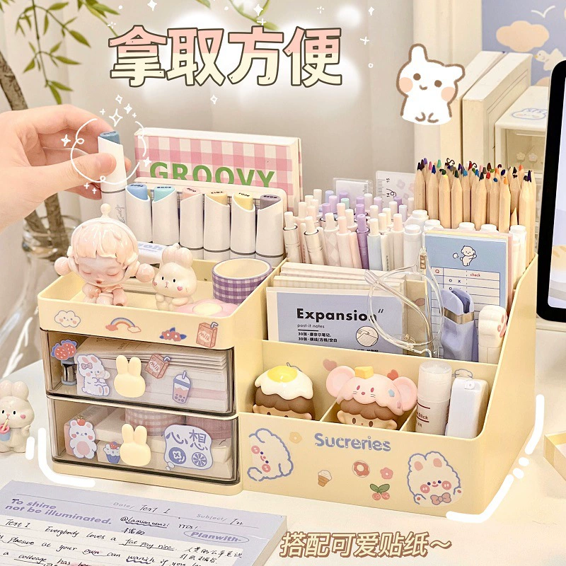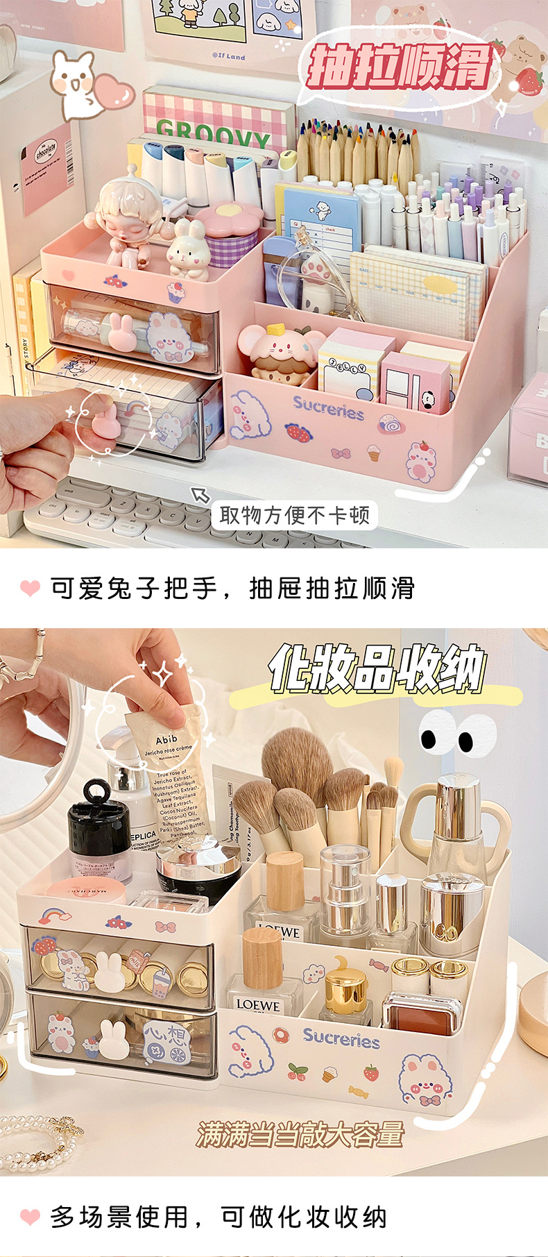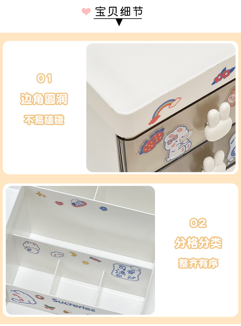 可爱桌面收纳盒透明兔柄文具书桌笔筒办公室收纳架 白色兔柄抽屉款